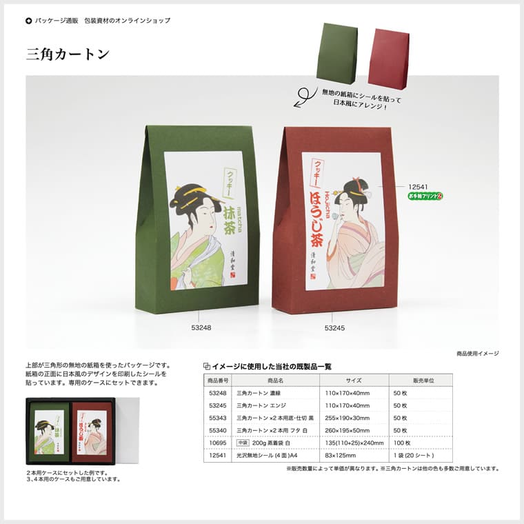 上部が三角形の無地の紙箱を使ったパッケージです。紙箱の正面に日本風のデザインを印刷したシールを貼っています。専用のケースにセットできます。