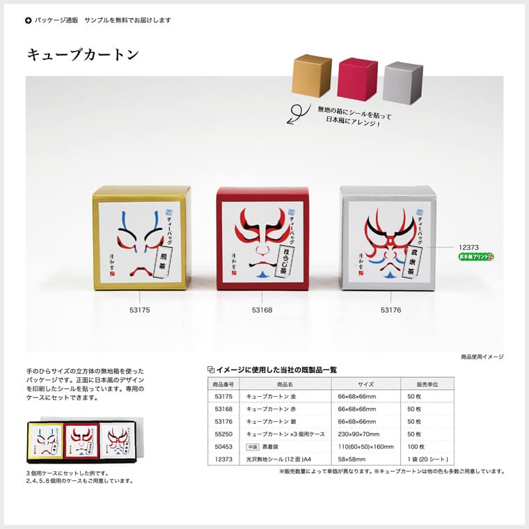 手のひらサイズの立方体の無地箱を使ったパッケージです。正面に日本風のデザインを印刷したシールを貼っています。専用のケースにセットできます。