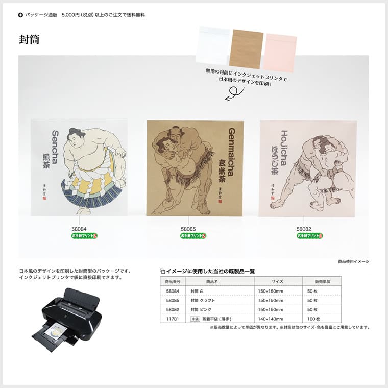 日本風のデザインを印刷した封筒型のパッケージです。インクジェットプリンタで袋に直接印刷できます。