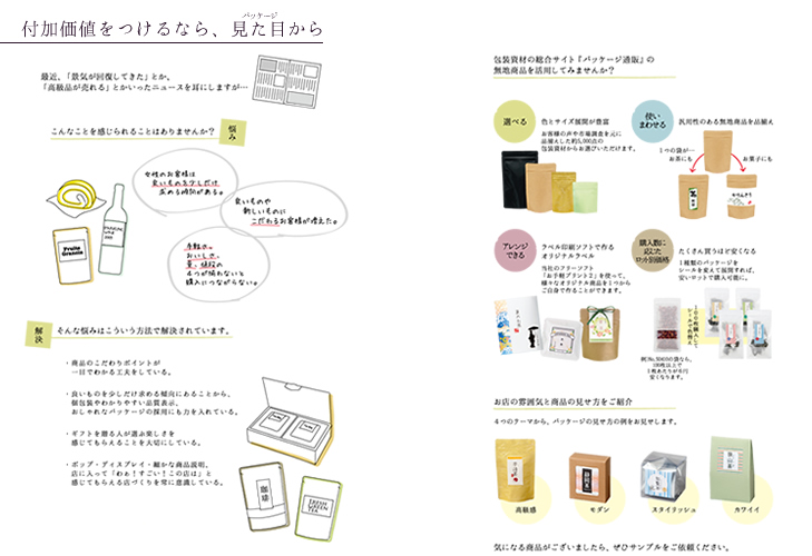 定番のクラフト袋やアルミ袋をはじめ、パステルカラー、マット調、個包装用、半透明袋など、日本茶の包装に適した6種類の無地袋をご紹介しています。