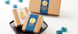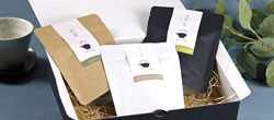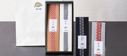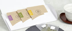 細長タイプの三角カートンに和柄のリボンを巻いた日本茶のパッケージです。お詰合せできる箱や、紙袋も一緒にいかがでしょうか。