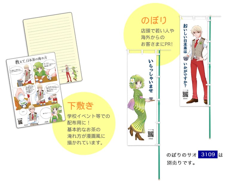 下敷きは、小学生を対象としたお茶の淹れ方教室での配布用などに。のぼりは、店頭でのPR用にご活用いただけます。